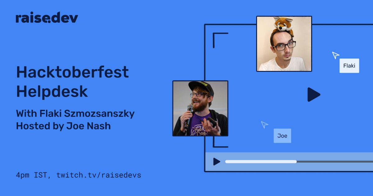 "text": "Miss todays #Hacktoberfest Helpdesk show? We're back tomorrow!\n\nYou can submit questions at raise.dev/hacktoberfest.\n\nOur special guests:\n- 4pm IST: @slsoftworks \n- 4pm CEST: @TartanLlama \n- 4pm EDT: @shanamatthews \n\n\ud83d\udc40\ud83d\udcfa Tune in at twitch.tv/raisedevs",