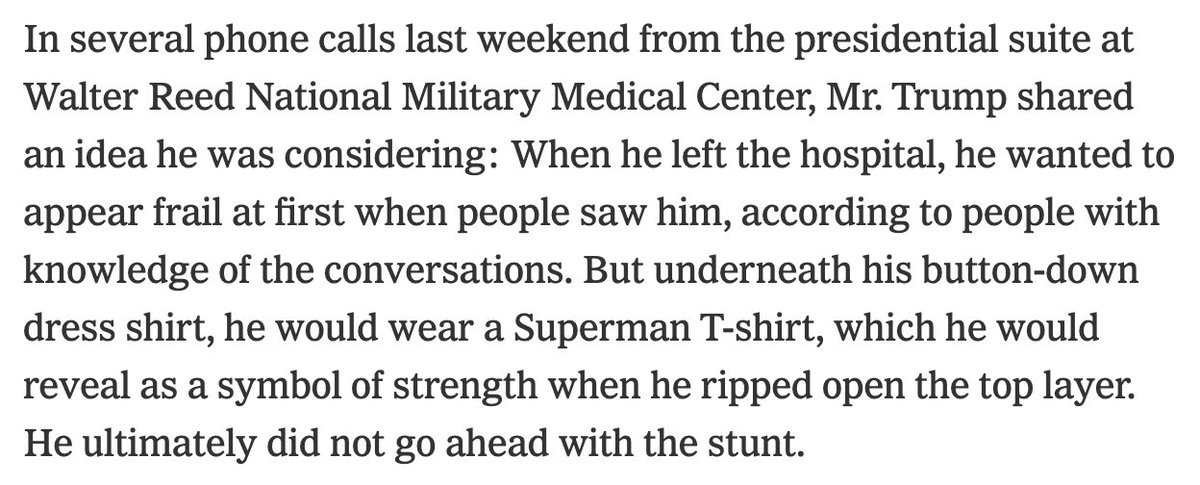 "text": "You have to read this to believe it.\n\nTrump was planning to appear frail and then rip over his dress shirt to reveal a Superman tee-shirt when he left the hospital, according to the @nytimes.\n\nWhenever I think Trump can\u2019t do something more ridiculous, he proves me wrong.",