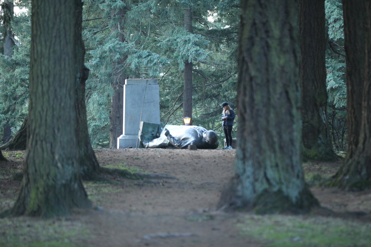 "text": "Statue of Harvey Scott toppled at Mt. Tabor park last night."