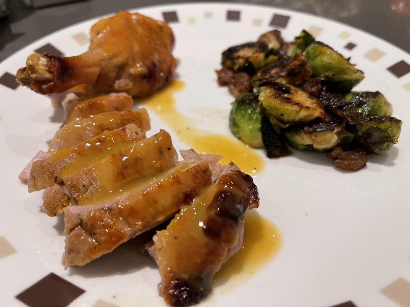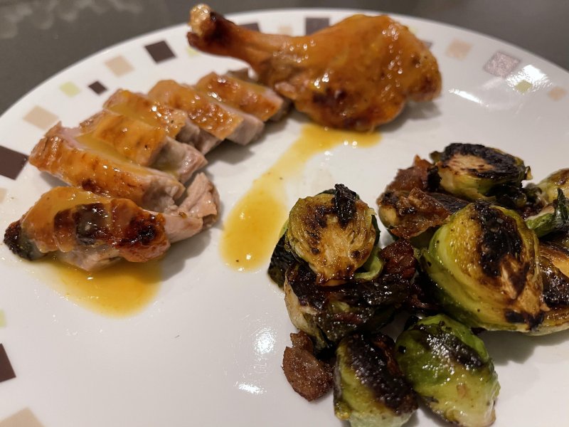 "text": "So, this was pretty tasty. The brussels sprouts were fried off in duck fat and tossed with crispy duck cracklins.\n\nNot the best dinner I\u2019ve made, but a solid celebration of the downfall of our wannabe king. Good riddance, Don. I hope you go to jail and are never heard from again."