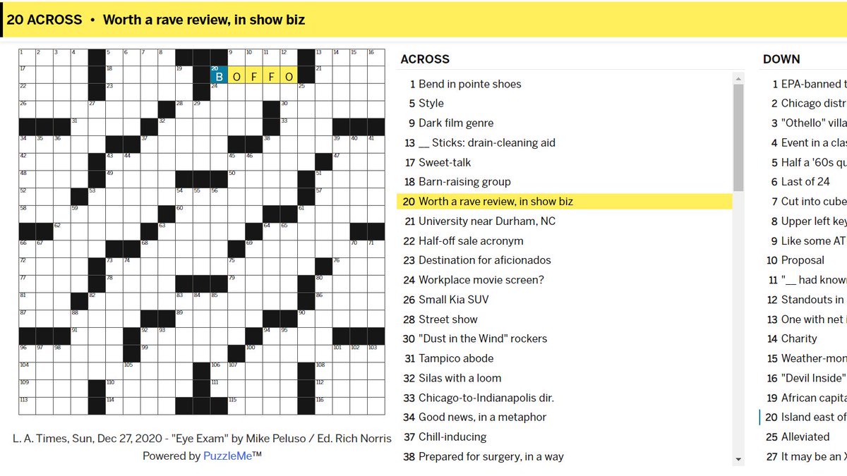 "text": "They didn\u2019t quite get my whole domain name in there, but Boffo is featured in today's LA Times crossword puzzle.\n(boffosocko.com/2020/12/27/bof\u2026)",