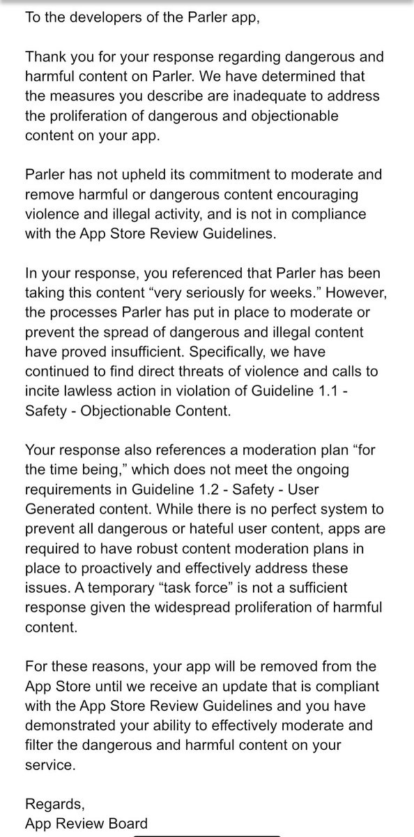 "text": "As Amy Peikoff, Parler\u2019s policy chief, said on Fox News last night: If Apple kicks us off the App Store, \u201cwe\u2019re toast.\u201d"