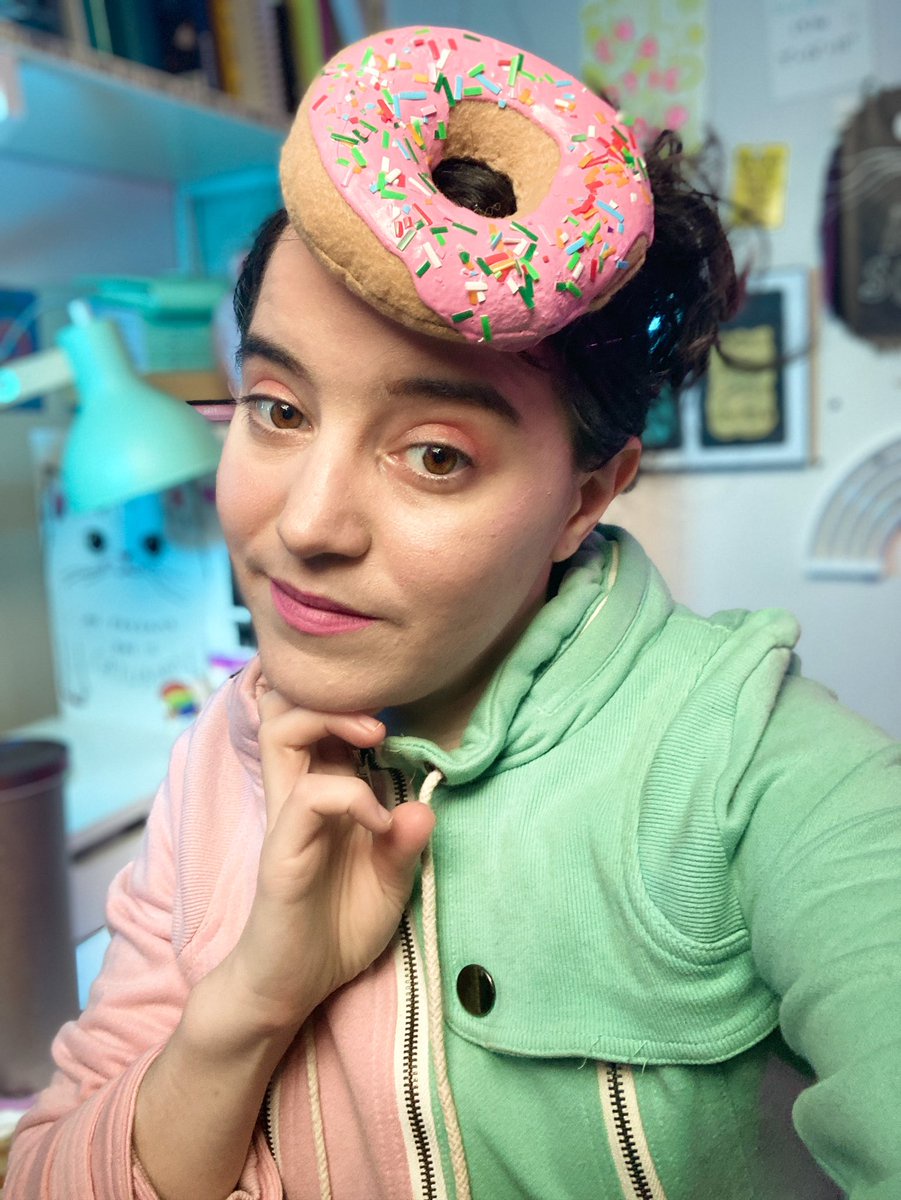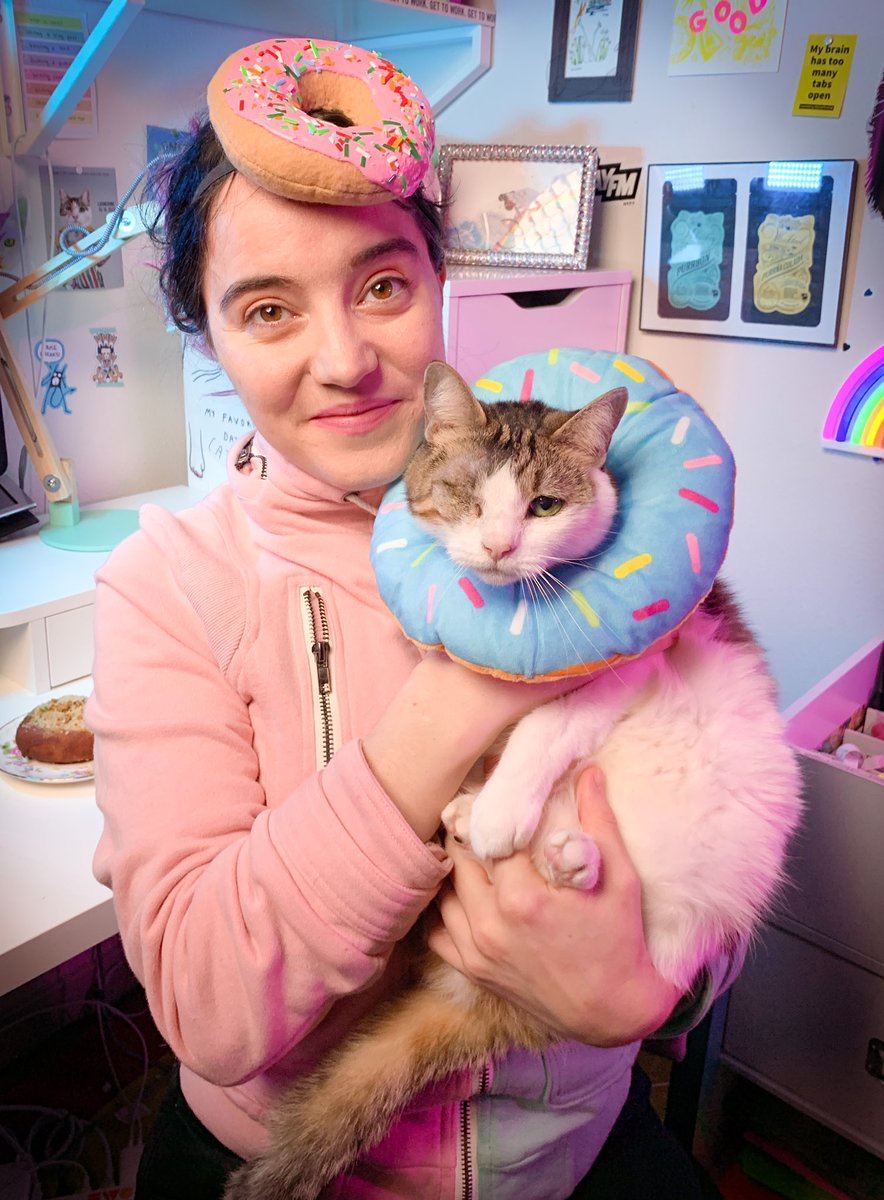 Going live with a donut on my head, soon to be in my mouth, and a cat with a donut on as well!
