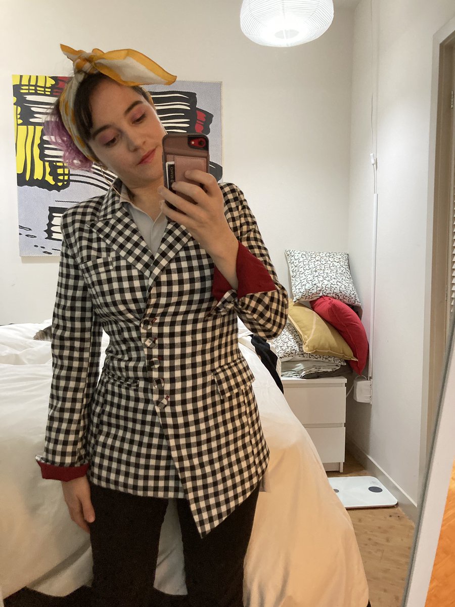 "text": "Today\u2019s blazer is this asymmetrical gingham piece that does not go with anything else I am wearing but I am making it work."