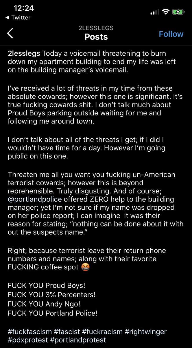 "text": "A local activist has received a very threating voicemail at their apartment about cutting the building's gas lines and burning it down. This comes after Andy Ngo has been repeatedly tweeting about this person since they've organized a few peaceful pickets against Andy's new book. twitter.com/_WhatRiot/stat\u2026",