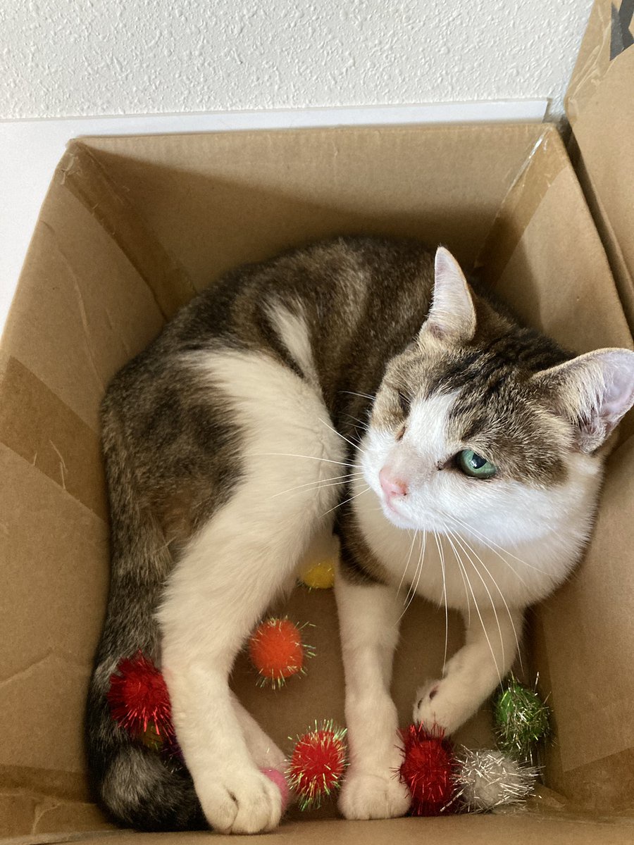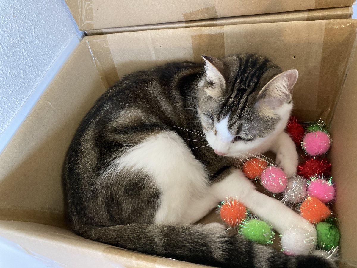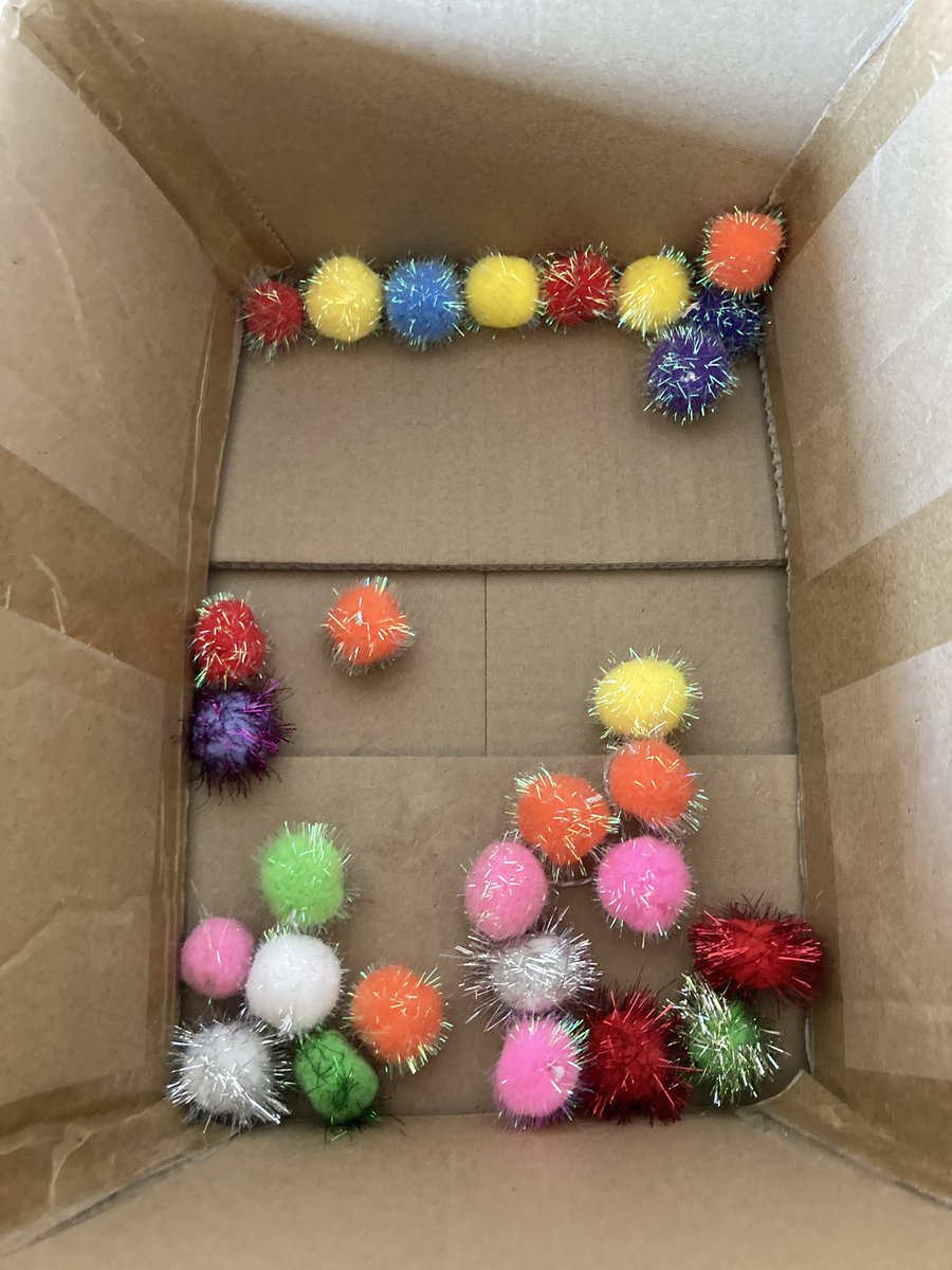 My cat has been engaged in a very elaborate game all morning of collecting sparkly balls from the couch and bringing them into the office. She is now up to 15. What is he...
