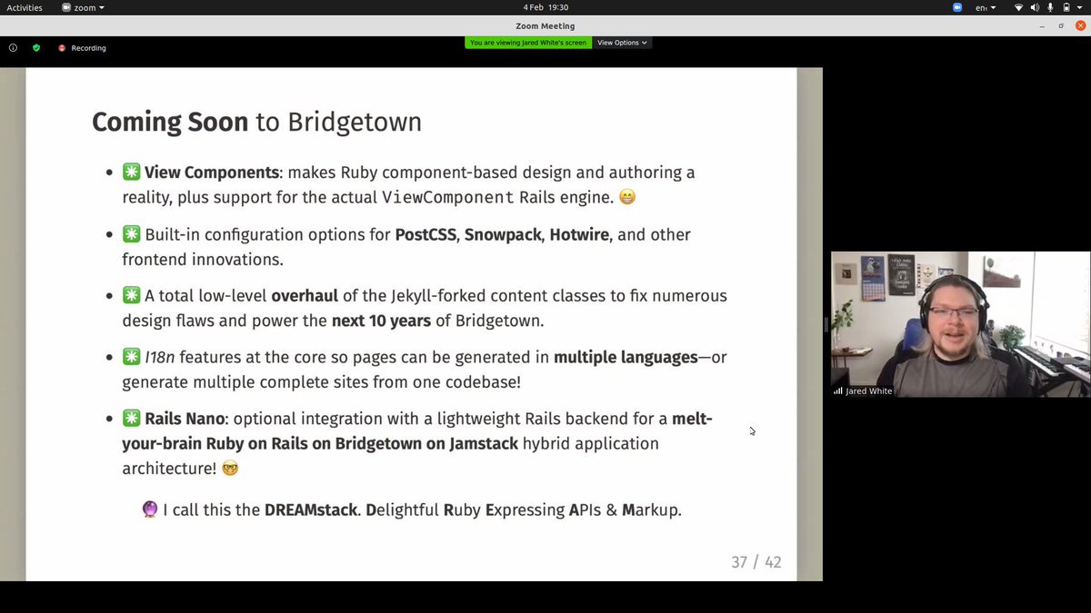 "html": "I am thrilled to be one of today/tonight's speakers with a presentation all about how I forked Jekyll and the subsequent rise of <a href=\"https://twitter.com/bridgetownrb\">@bridgetownrb</a>. Come join us at 10am U.S. Pacific/1pm Eastern!"