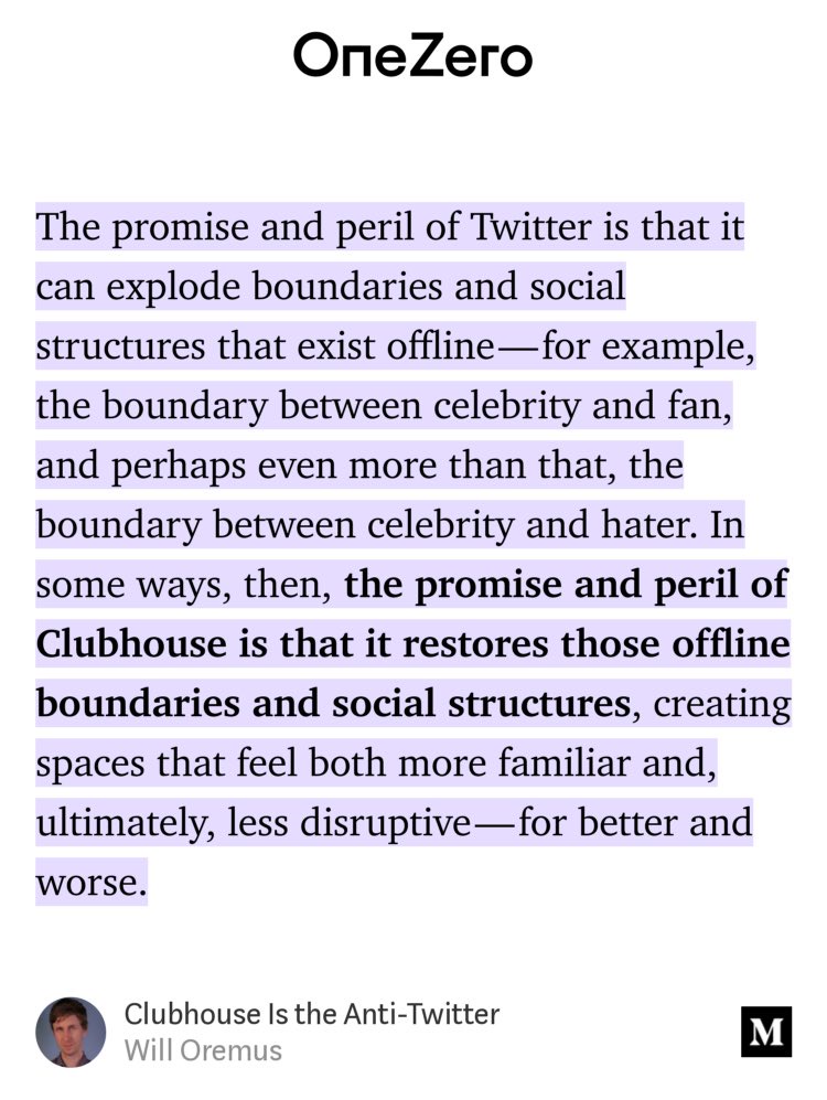"html": "\u201cClubhouse Is the Anti-Twitter\u201d by Will Oremus\n<a href=\"https://link.medium.com/4geGxQODGdb\">link.medium.com/4geGxQODGdb</a>"
