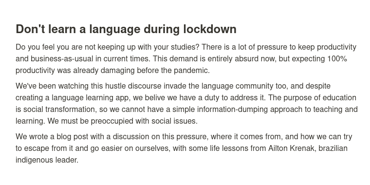 TFW the founder of a tiny, bootstrapped language learning app tells you *not to learn a language* during pandemic lockdown, discussing the ramifications of stress and coping techniques in a blogpost! 💖💖💖👏👏👏