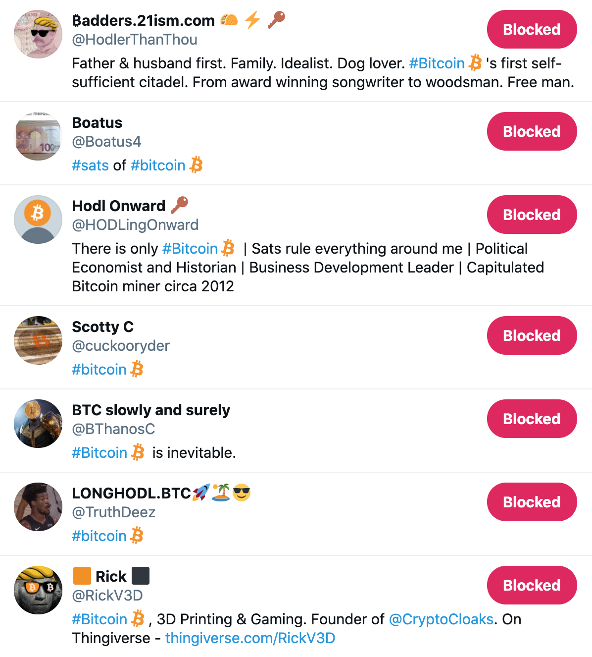 The bot searches my replies and blocks accounts with "bitcoin", "hodl" and similar words in the bio 😀
