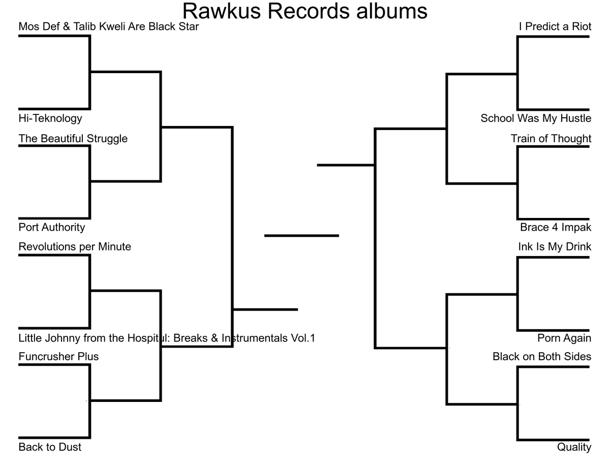 "text": "this is a tough one. my Rawkus Records albums bracket"