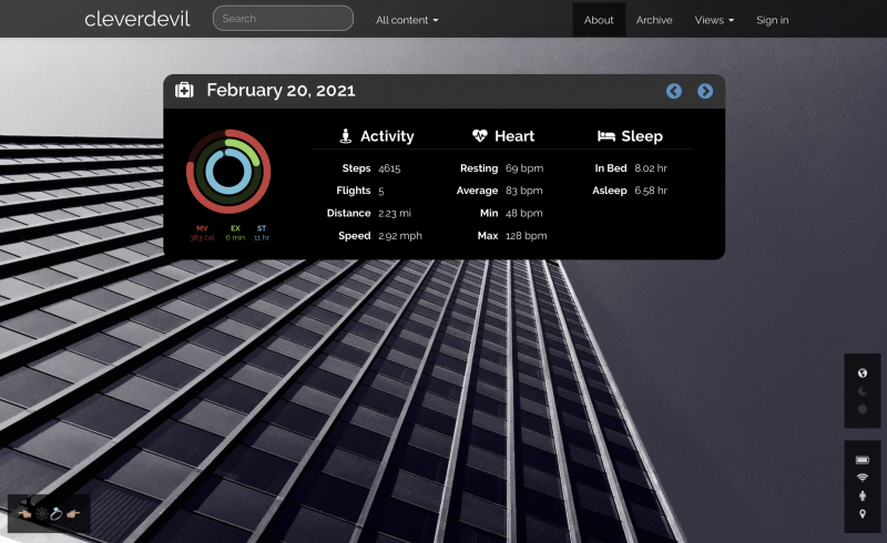 "text": "No, it\u2019s not yet publicly linked from my site. Yes, the activity ring is animated on load. #IndieWeb #OwnYourData",