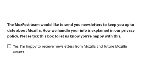 "text": ".@mozillafestival and any conference/event/community please please please for the love of gosh add an\n\u2610 I am already subscribed!\noption to your\n\u2610 Sign me up for the newsletter\ncheckboxes.\n\nYour data will thank you. \ud83d\ude4f",