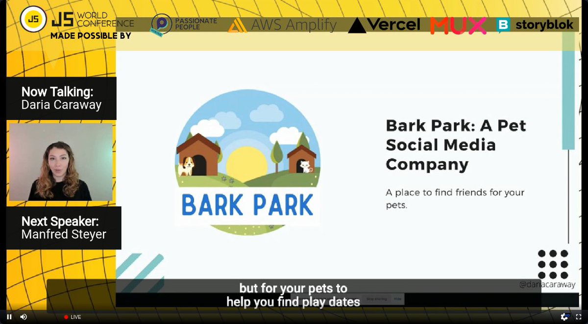 "text": "FROM NOW ON EVERY JAVASCRIPT TALK NEEDS TO BE PRESENTED IN \ud83d\udc15 BARK PARK \ud83c\udf33 SORRY NOT SORRY I DON'T MAKE THE RULES.\n\n@dariacaraway #jsworldconference",