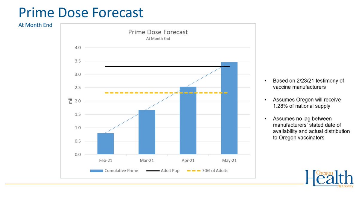 "If Oregon’s prime dose allocation increases to approximately 200,000 doses per week Oregon would have enough first doses to vaccinate: 7 in 10 adults by the end of Apr...