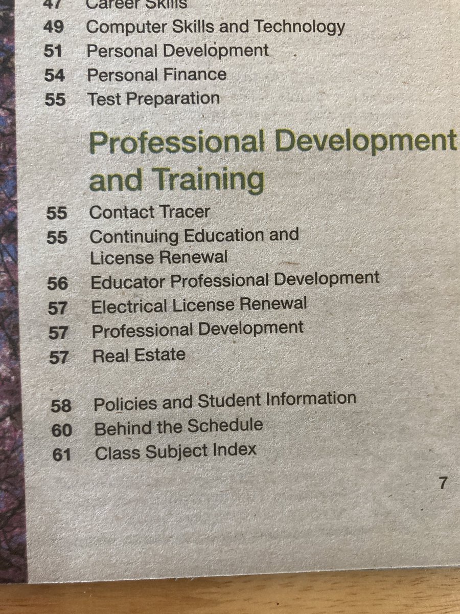 "text": "Sign of the times: thing listed under the community college catalog\u2019s \u201cprofessional development\u201d is Contact Tracer"
