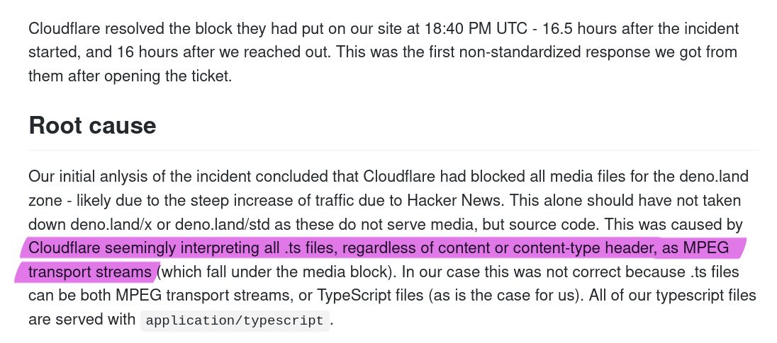 This is hilarious! HN traffic to a blogpost made Cloudflare block every single .ts file on @deno_land's primary registry — simply because both TypeScript & MPEG transport stream files (often used in e.g. HLS video streaming) share the .ts extension :'D