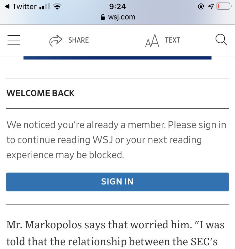 "text": "Good news: The WSJ has discovered how cookies work, and can now remember that I\u2019ve had a subscription with them for many years.\n\nBad news:"