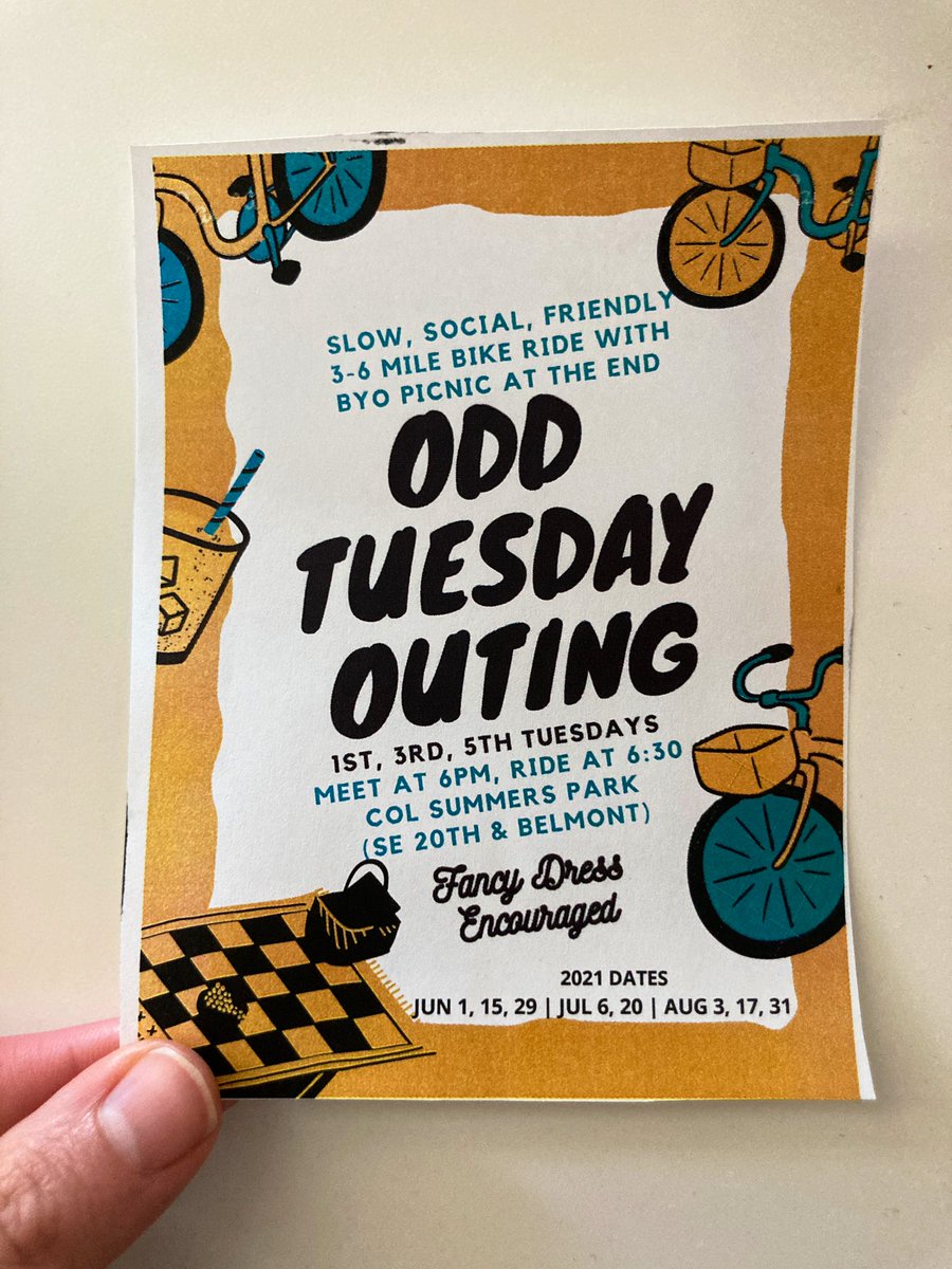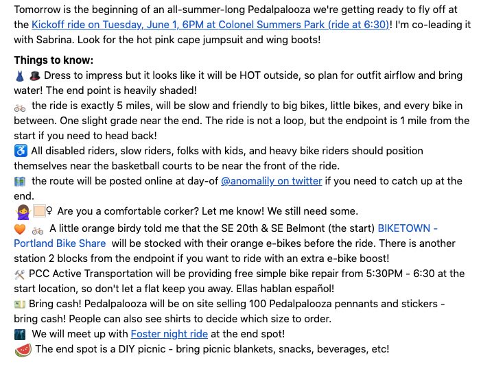 "text": "All the details you need to know about the @Pedalpalooza Kickoff edition of the Odd Tuesday Outing June 1st at 6PM! Lots of ways to join and friendly to all riders (even if you don\u2019t have a bike), make sure to bring water and picnic snacks for the end. shift2bikes.org/calendar/event\u2026",