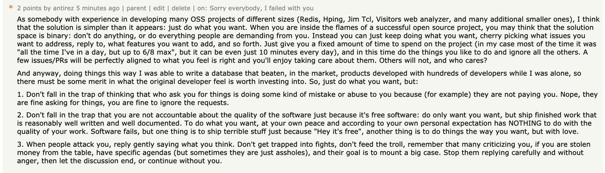 "text": "This sort of take really rubs me the wrong way. Maintainers vs. \"free users\" seems like a foolish and unnecessary war footing. *Of course* they have expectations, everyone does. Also, I'm *glad* if they make money off anything I've worked on. Yeesh!"
