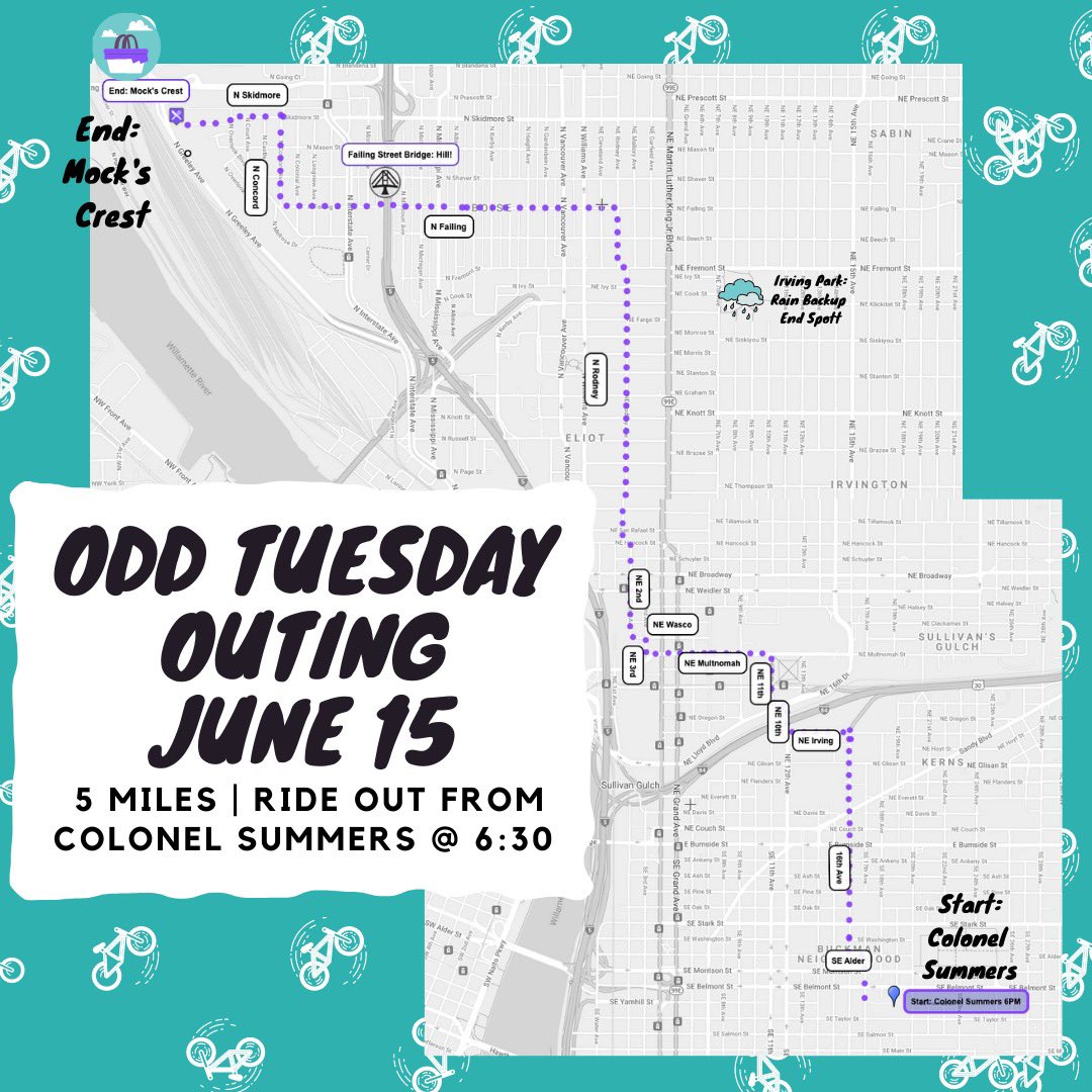 Route for tonight’s Odd Tuesday Outing picnic ride- scenic gorgeous end spot, dress to impress, bring snacks! Please note we have a backup end location in case of rain. Meet at Colonel summers at 6PM, ride at 6:30. #pedalpaloozapdx scribblemaps.com/maps/view/June…