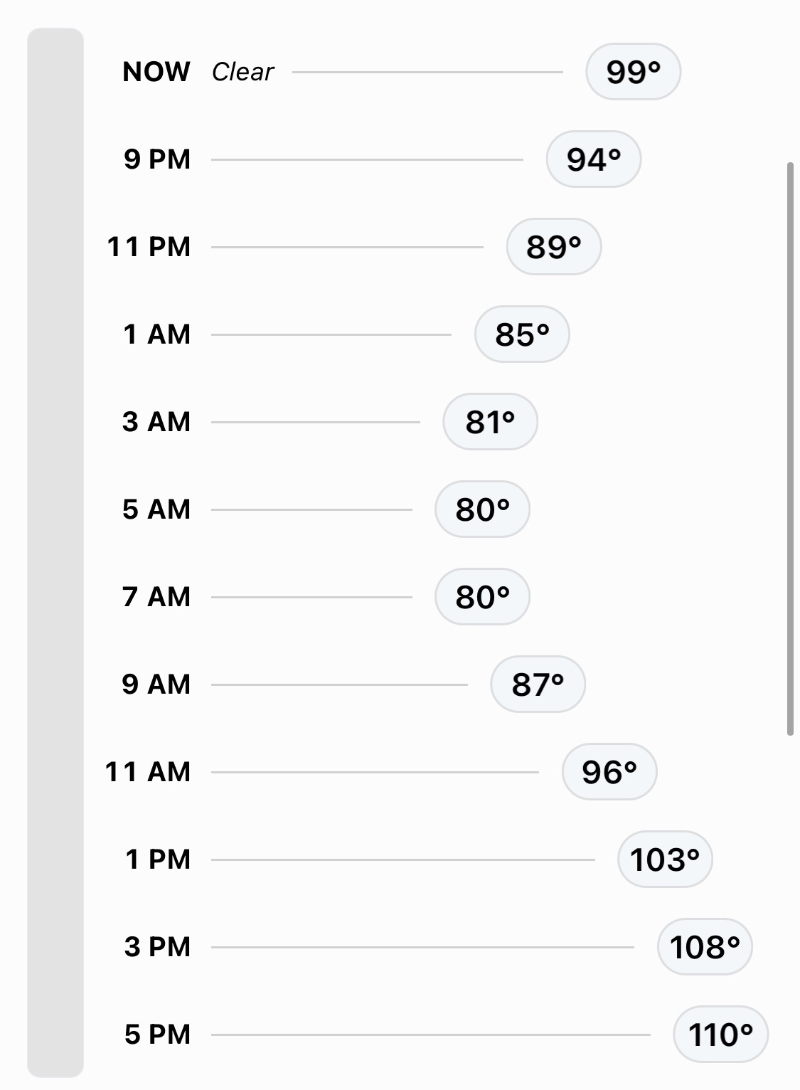 Looks like the temperature reached the peak today at 5pm, my sensor outside in the shade recorded 104.7°F (40°C). So far the AC is holding up, but I'm a bit worried that the *low* tonight is expected to be 80°!
