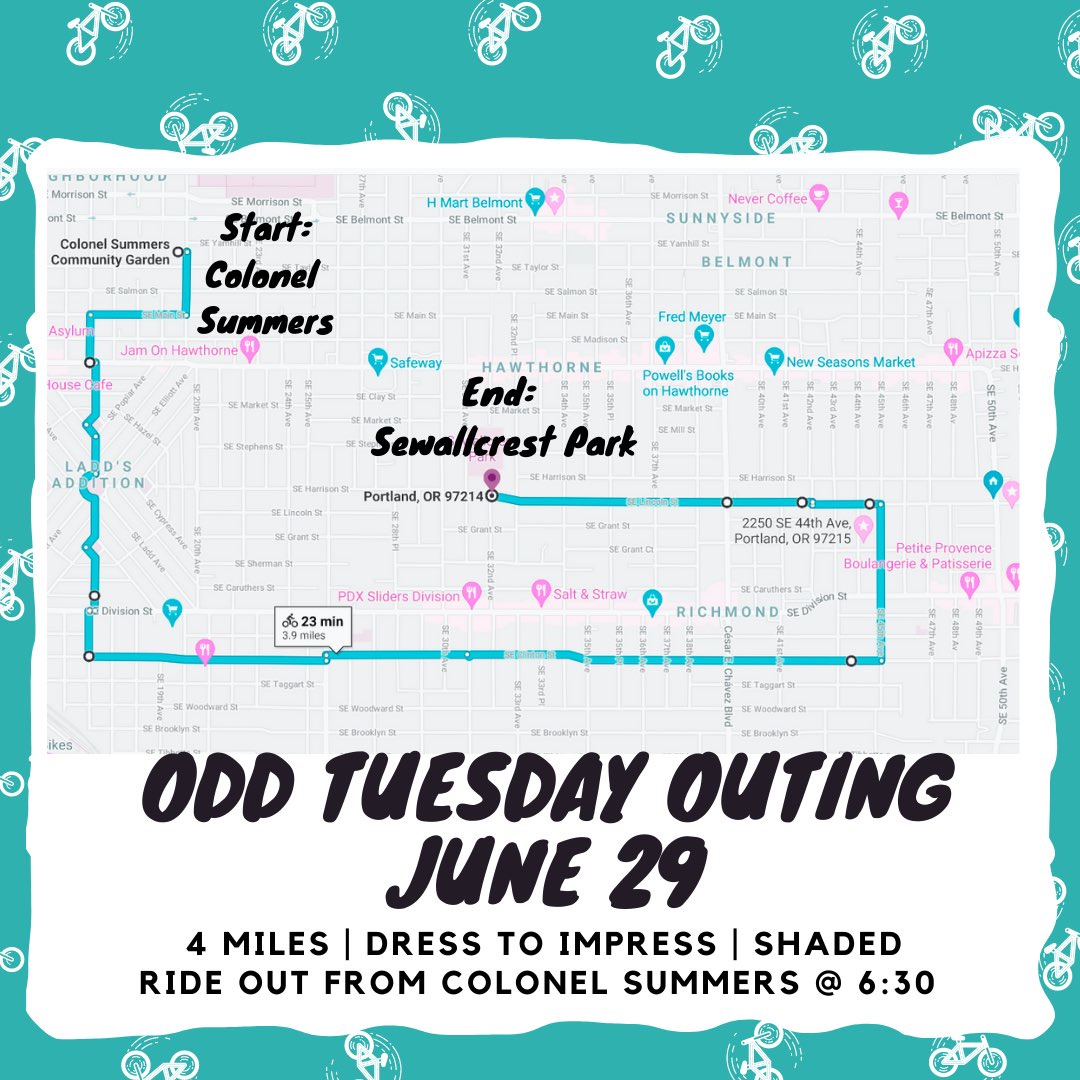 The route for today’s Odd Tuesday outing, meets at Col Summers at 6PM. It will be a cool 90F, slow pace, 4 mile mostly shaded route! No riders left behind, kid friendly. Dress to impress and bring picnic snacks 💃🏾🕺🏾🥨🍿🚲shift2bikes.org/calendar/event…