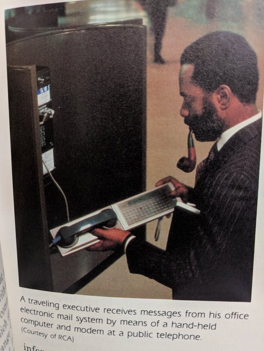 "text": "Smoking gentleman using an acoustic coupler to send an email with a payphone. Early 1980s"