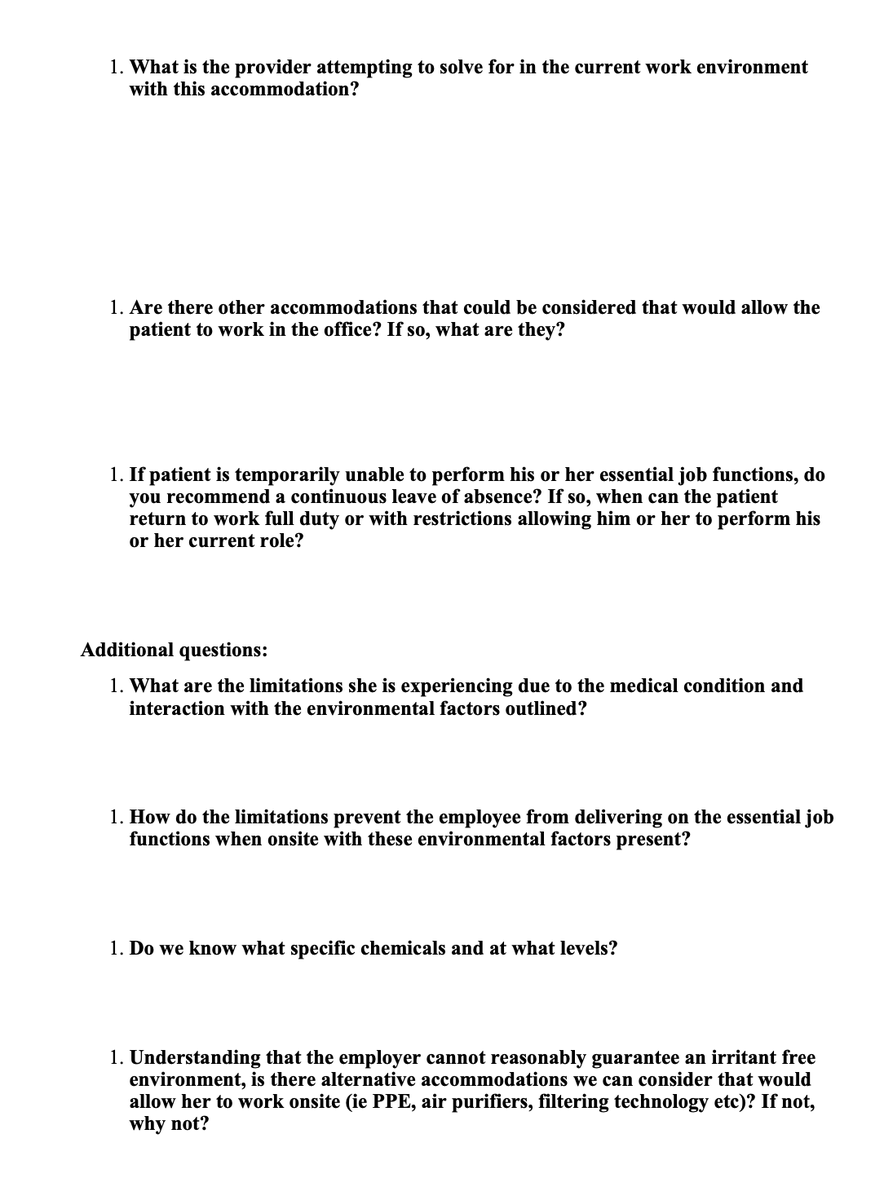 When Apple employees don't want to sign the medical release form, they're given these questions from Sedgwick, the third-party company that Apple uses to process these claims. The form needs to be returned by a doctor within 2 weeks (there are 18 questions in all)