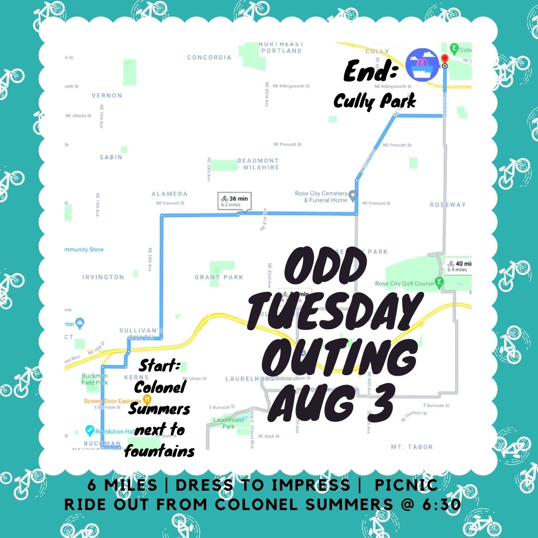 Hope to see you at Odd Tuesday Outing tonight! We meet at Colonel Summers at 6PM, ride at 6:30PM. Tonight's end spot (Cully Park) should be a great spot to watch the sunset! #pedalpalooza