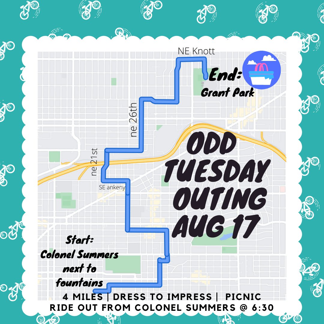 Hope to see you at the Penultimate @pedalpalooza Odd Tuesday Outing tonight! We meet at Colonel Summers at 6PM, ride at 6:30PM. Tonight's end spot (Grant Park) is a nice place for a lovely picnic in this *reasonable* weather! #pedalpalooza shift2bikes.org/calendar/event…