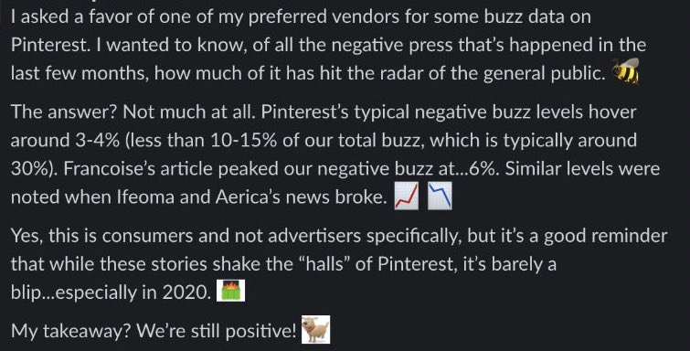 "html": "Real yikes of a message from Pinterest\u2019s director of brand research the summer after <a href=\"https://twitter.com/IfeomaOzoma\">@IfeomaOzoma</a> and <a href=\"https://twitter.com/erikashimizu\">@erikashimizu</a> broke the story on allegations of racism & sexism at the company. \u201cWhile these stories shake the halls of Pinterest, it\u2019s barely a blip\u2026especially in 2020.\u201d"