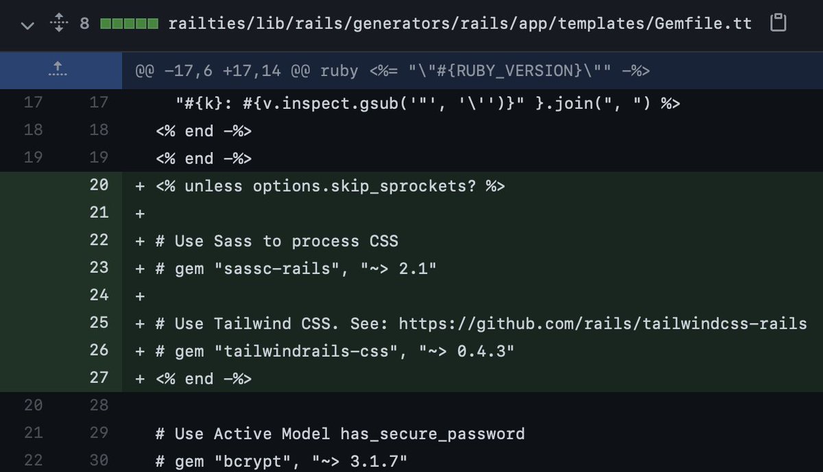 "html": "Rails 7: Promote <a href=\"https://twitter.com/tailwindcss\">@tailwindcss</a> as an alternative to Sass. <a href=\"https://github.com/rails/rails/pull/43110\">github.com/rails/rails/pu\u2026</a>"