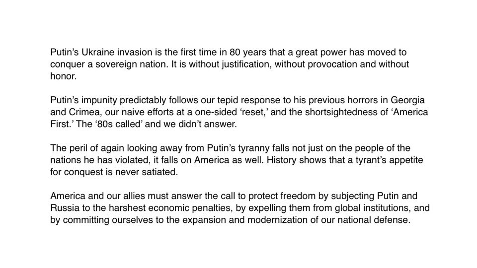 "text": "An aggressor nation invading a neighboring sovereign nation under false pretenses must never be tolerated. The whole world must rise up to declare this Russian invasion unequivocally unacceptable. #IStandWithUkraine",