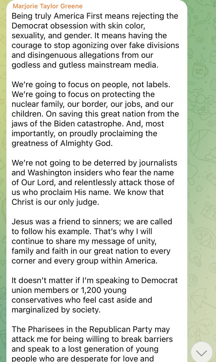 "text": "Rep. Marjorie Taylor Greene responds to condemnation for appearing at white nationalist conference: \u201cI won\u2019t cancel others in the conservative movement, even if I find some of their statements tasteless, misguided or even repulsive at times.\u201d"