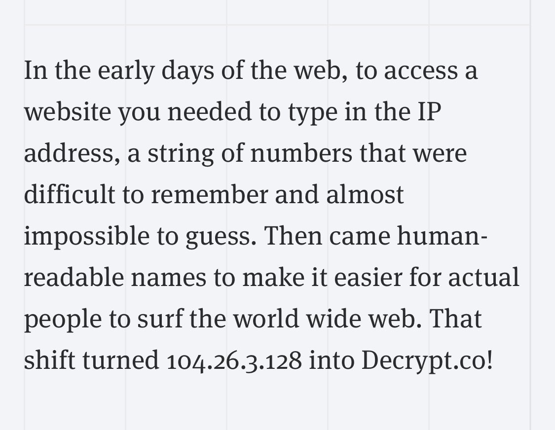 I was searching for a summary on ENS and came across an article with this preamble. Pffff! DNS *predates* the WWW and it supported human readable names from the very beginning!