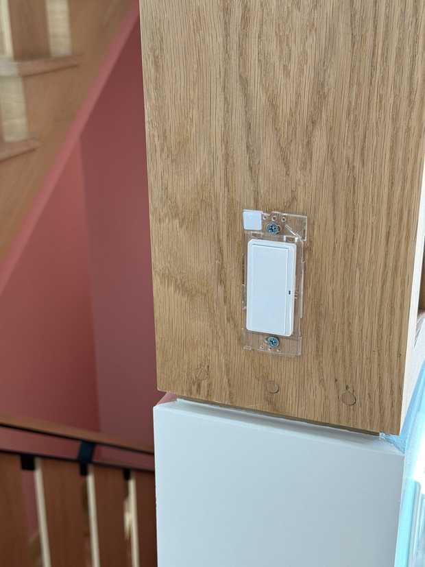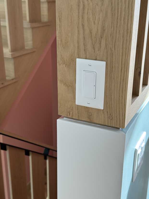 "text": "The cool thing about Lutron Pico remotes is you can add a switch anywhere, including \"impossible\" places like the side of this wood railing"