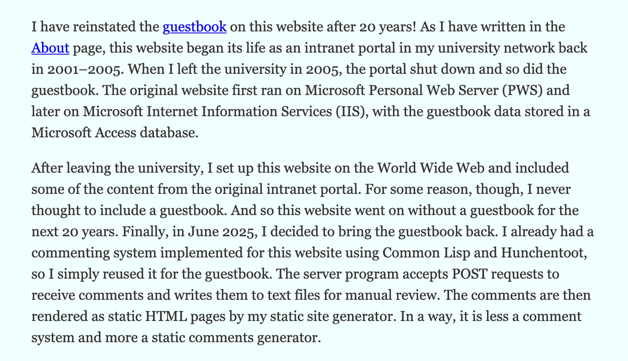 "text": "I Reinstated My Guestbook After 20 Years: https://susam.net/reinstated-guestbook.html\n\n#blog #post #web #webdev #indieweb #programming"