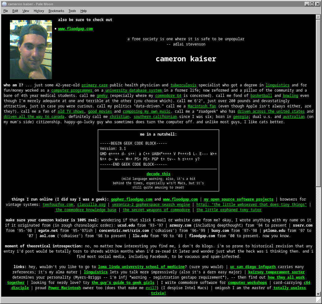 I really like personal homepages and have quite a list of them bookmarked. I'll post one every week unless I fall behind this schedule. 😉 So here's Cool Personal Homepages #CPHP Vol. 49: "cameron kaiser" http://www.armory.com/~spectre/