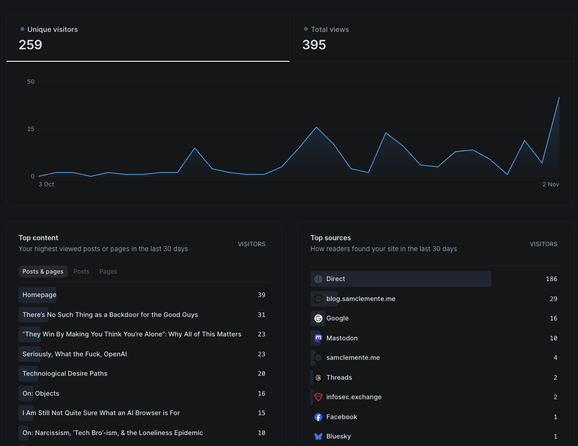 "text": "And just like that, @thedigitalrenaissance has had over 250 unique visitors this month!\n\nI don't put tracking params in the links I post so for the most part I don't have a whole lot of insight outside of how many people are on the site and what posts get read\n\n#Blog #SmallWeb #IndieWeb #SocialWeb #GhostCMS #Writing #Blogger"