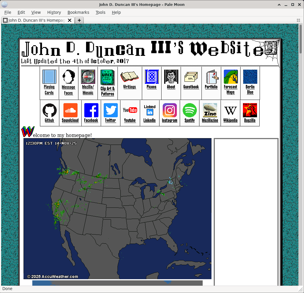 I really like personal homepages and have quite a list of them bookmarked. I'll post one every week unless I fall behind this schedule. 😉 So here's Cool Personal Homepages #CPHP Vol. 52: "John D. Duncan III's Homepage" https://cs.gettysburg.edu/~duncjo01/