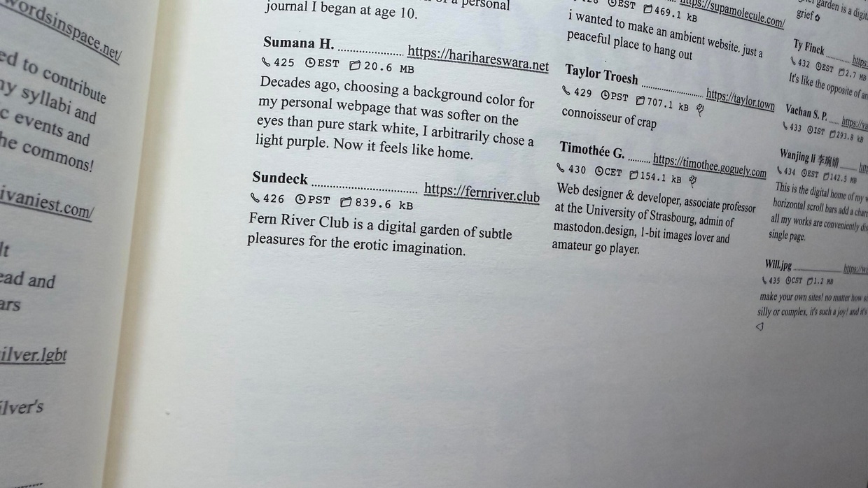"text": "Do any of you #SmolWeb or #IndieWeb folks have a copy of the Internet Phone Book handy? I think I'm in there, but I don't know my dial-a-site number. Help!\n\nShould be under \"Fern River Club\"."