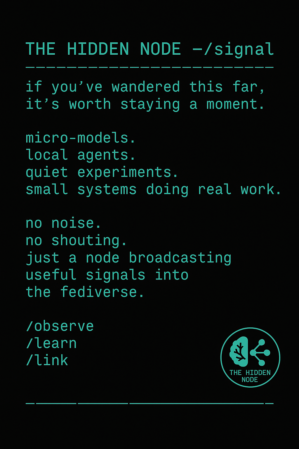 "html": "<p>THE HIDDEN NODE \u2014 /signal<br />\u2500\u2500\u2500\u2500\u2500\u2500\u2500\u2500\u2500\u2500\u2500\u2500\u2500\u2500\u2500\u2500\u2500\u2500\u2500\u2500\u2500\u2500\u2500\u2500\u2500</p><p>if you\u2019ve wandered this far,<br />it\u2019s worth staying a moment.</p><p>micro-models.<br />local agents.<br />quiet experiments.<br />small systems doing real work.</p><p>no noise.<br />no shouting.<br />just a node broadcasting<br />useful signals into the fediverse.</p><p>/observe<br />/learn<br />/link</p><p><a href=\"https://mastodon.social/tags/AI\">#<span>AI</span></a> <a href=\"https://mastodon.social/tags/indieweb\">#<span>indieweb</span></a> \ud83d\udcf1\ud83d\udcbb\ud83e\udde0\u2728</p>",