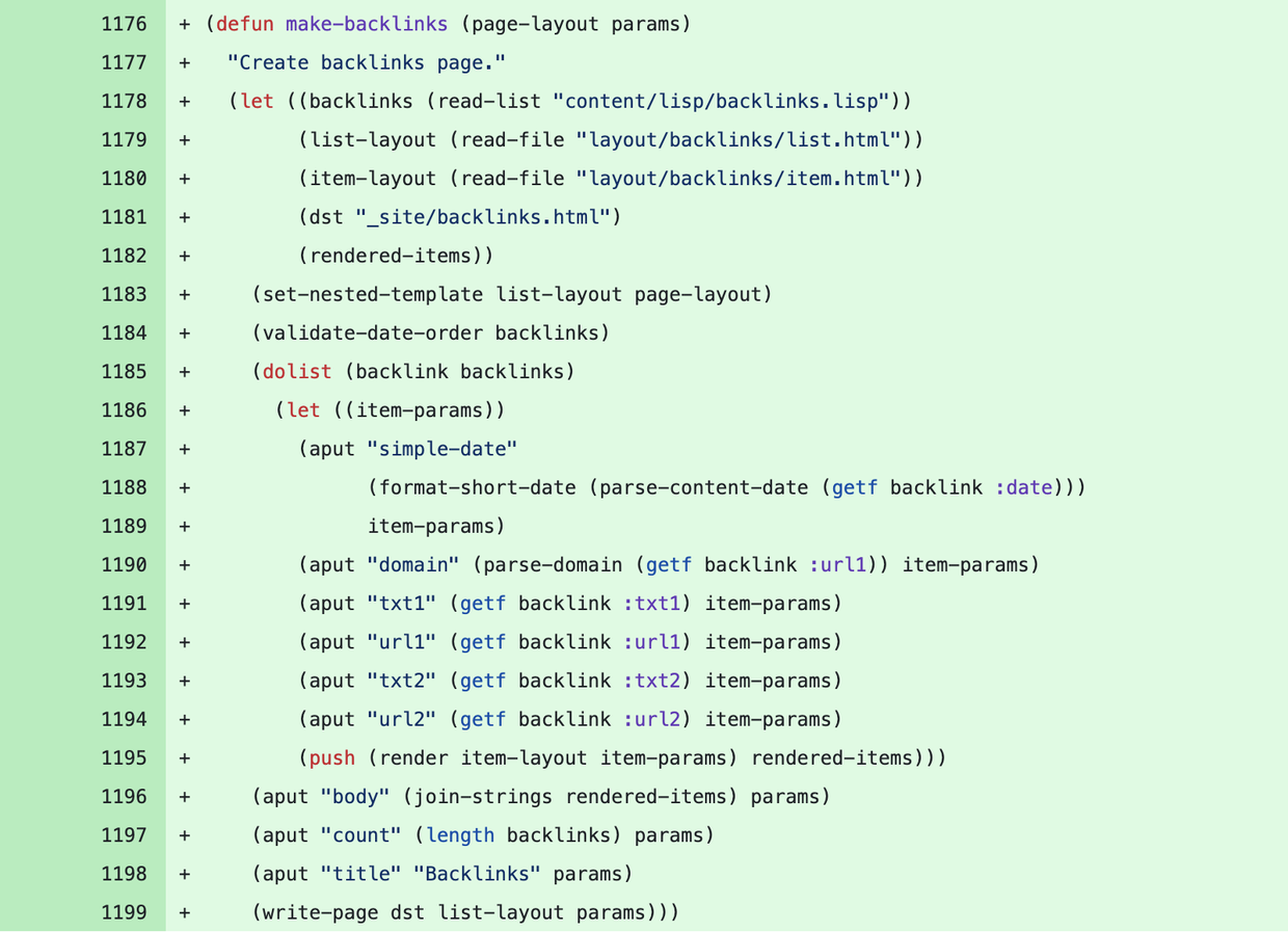 For example, today I thought I'd add a backlinks page to my website and it took only 15 minutes or so to write a new function that generates the backlinks page merely by invoking a few existing functions.