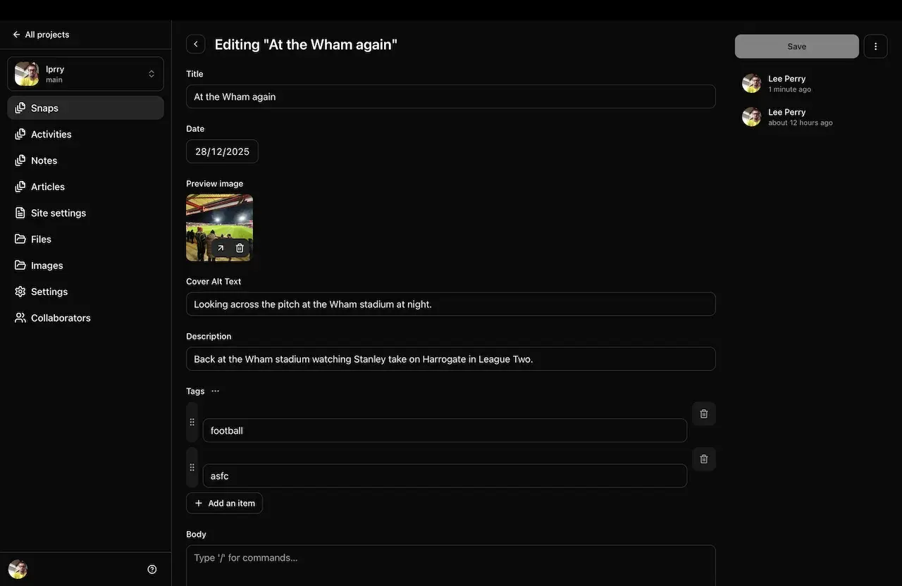 "html": "<p>One of my objectives for this week off was to connect a CMS to my 11ty site to make it easier to post from mobile - here is PagesCMS editing my repo directly, with Netlify auto publishing any commits. \u2705 <a href=\"https://prry.uk/tags/notes\">#<span>notes</span></a> <a href=\"https://prry.uk/tags/indieweb\">#<span>indieweb</span></a> <a href=\"https://prry.uk/tags/eleventy\">#<span>eleventy</span></a> <a href=\"https://prry.uk/tags/changelog\">#<span>changelog</span></a></p><p>Pages CMS - <a href=\"https://l.prry.uk/notes/2025-12-30-note/\"><span>https://</span><span>l.prry.uk/notes/2025-12-30-not</span><span>e/</span></a></p>",