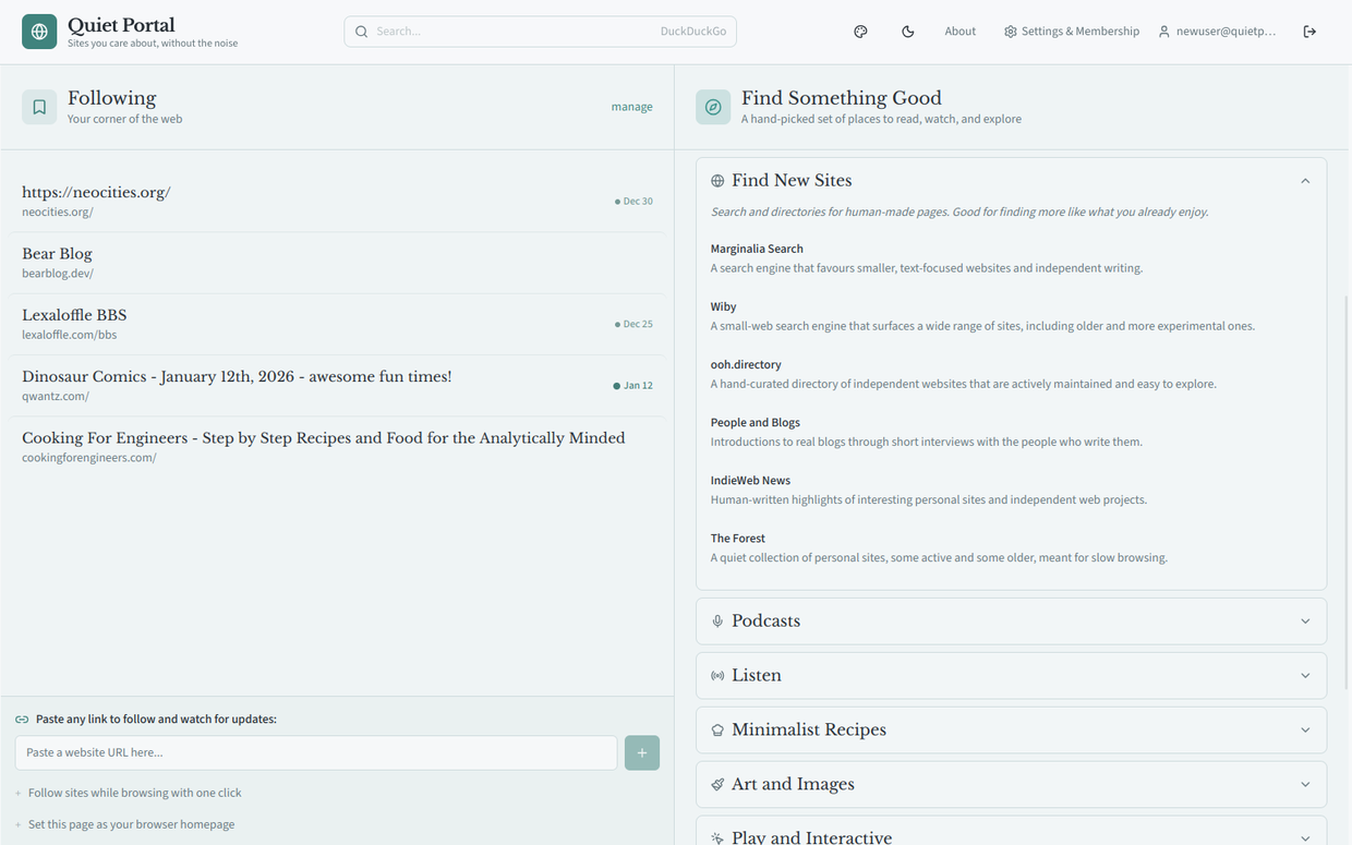 I've made a lot of changes to try and clarify the UI for my RSS-based portal to the small web. Feedback or feature suggestions are very welcome. I'm also interested in recommendations for sites to feature in the directory related to blogging. Link: https://quietportal.com/ #smallWeb #indieweb #rss #blog #blogging