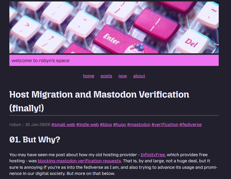 "text": "\ud83d\udea8 LONG POST ALERT! \ud83d\udea8 \n\nHow I (finally) migrated hosts and got verified on #Mastodon (*finally* finally):\n\n\ud83d\udc49 https://robyn.digital/2026/01/host-migration-and-mastodon-verification-finally/\n\n#smallWeb #indieWeb #blog #blogging #website"