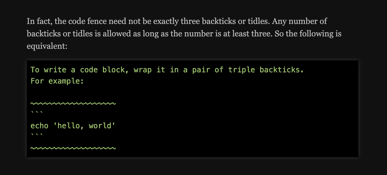 "text": "The Art of Nested Code Fencing in Markdown: https://susam.net/nested-code-fences.html\n\n#blog #post #markdown #programming #technology #webdev #indieweb"