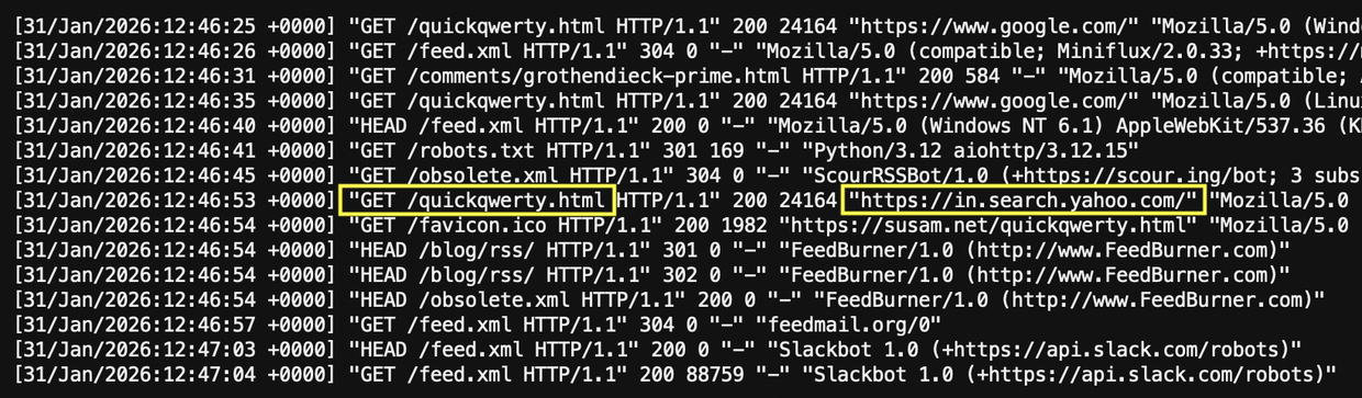 It is always a joy when I see something like this in my web server access logs. People still use Yahoo, and here someone used it to reach my first ever open source project.