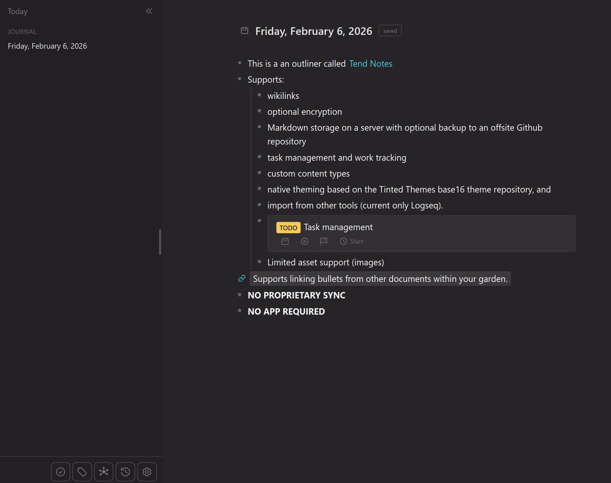 So I'm going public with a project I've been working on: github.com/Tend-Notes/tend/. I've been disappointed at the state of note-taking tools. Too complicated, too monetized, too unstable. I set out to build a self-hosted, always free, outliner/digital garden, based on Markdown, accessible from anywhere with a browser, with optional encryption, backlinks, bullet cross referencing, etc. Very alpha, no representations or warranties, provided AS-IS. AI-assisted development. #indieweb #selfhosting